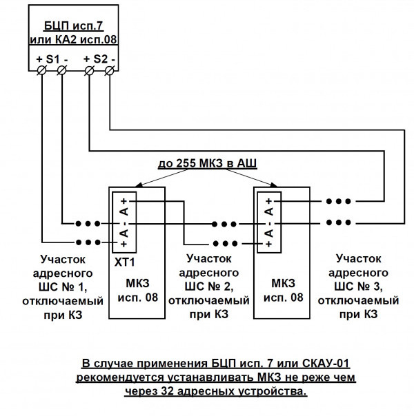 МКЗ исп.08 - модуль изоляции короткого замыкания адресный предназначен для автоматического отключения участка адресного шлейфа (АШ) в состоянии короткого замыкания и подключается в 2-ух проводный адресный шлейф: БЦП исп.7, 7-1, 7У, 7-1У, СКАУ-01 исп.1_2 или КА2 исп.08, 08-1.