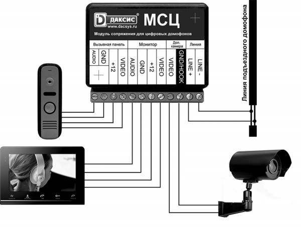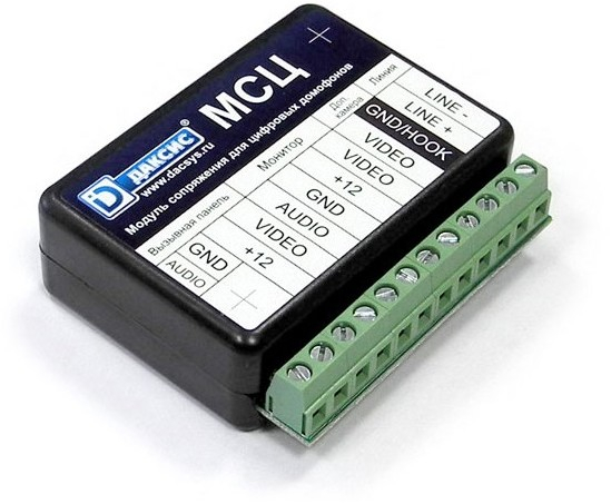 МСЦ - модуль сопряжения индивидуального видеодомофона с общеподъездным многоквартирным цифровым домофоном предназначен для подключения индивидуального видеодомофона к линии связи общеподъездного домофона с цифровой линейной системой адресации абонентов (ДАКСИС, Proel, Laskomex, Keyman-Polylock, Маршал-Raikmann, Метаком выпуска после 2015г. и аналогичных) для приема вызовов от него и открывания подъездной двери с помощью стандартных функций видеодомофона.