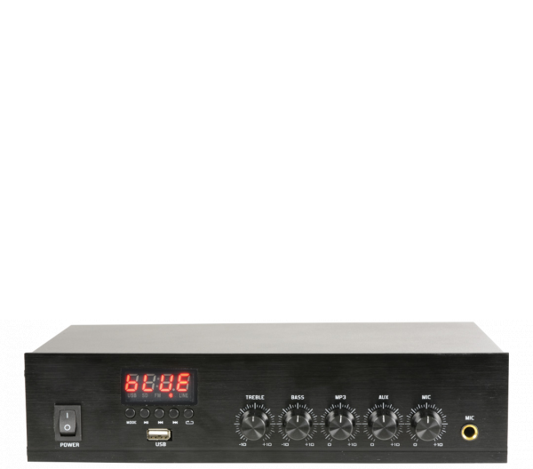 PA-1060 - трансляционный 1-зонный усилитель выходной мощностью 60 Вт., а также MP3 плеером (USB) и FM радио предназначен для усиления звукового сигнала с целью его дальнейшей трансляции на громкоговорители 4 - 16 Ом или с питанием 100 В.