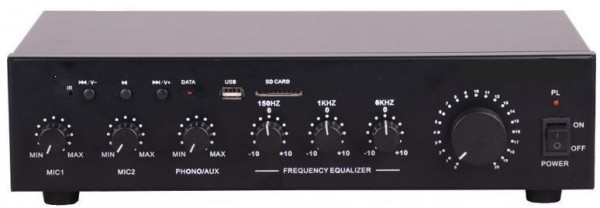 Настольный усилитель со встроенным модулем MP3 (USB/SD-карт). FM-тюнер,ИК-пульт управления. Микрофонный вход 2шт.Мощность (RMS) 60Вт. Выход/Импеданс 100В / 4Ом/8Ом/16Ом.Электропитание 220В/50Гц. Габариты (WxHxD) 320x190x80 мм.Вес 5 кг.