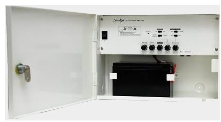 Настенный трансляционный усилитель-микшер 30Вт 1+1 микр./1 лин. вх 20...20000Гц 30В/8 Ом/4 Ом ~220В/50Гц резерв. пит.12В под акк.7Ач 317х80х225мм 3кг