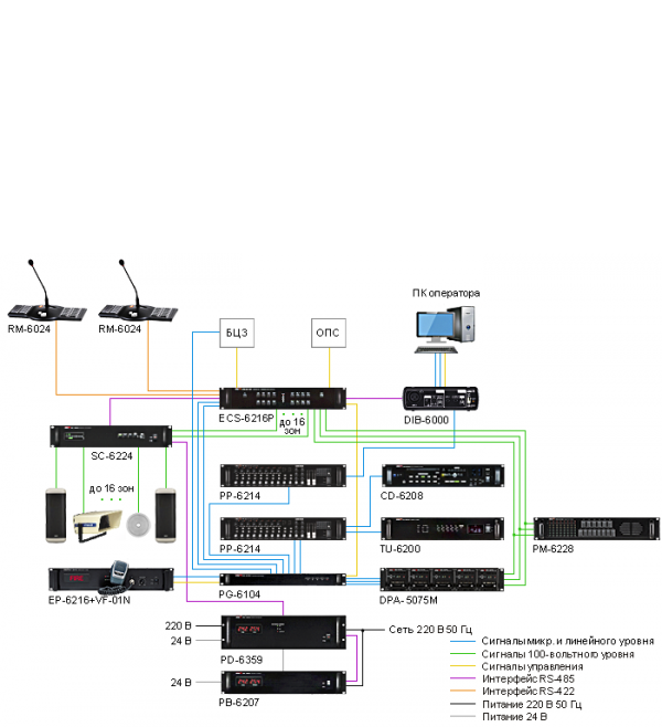 Контроллер ECS-6216P распределяет усиленный сигнал по зонам.