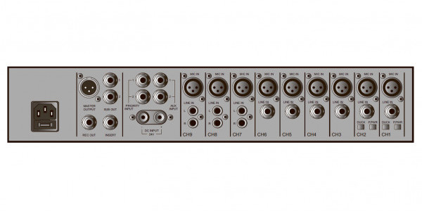 Кроме линейного выхода MASTER на задней панели устройства предусмотрено 2 дополнительных линейных выхода, 1 выход для подключения записывающего устройства и разъем INSERT для подключения блоков обработки звука.