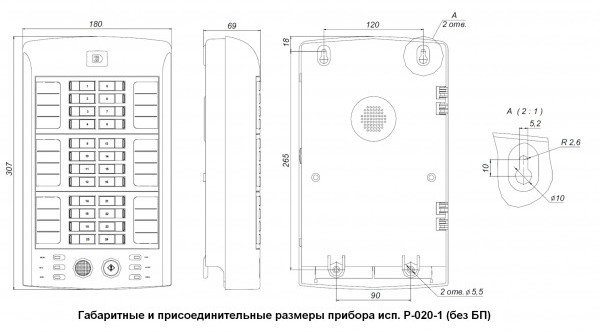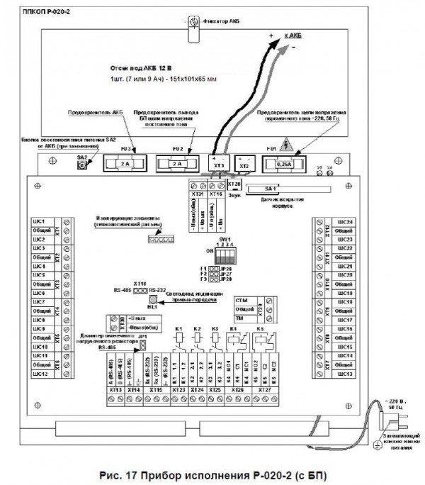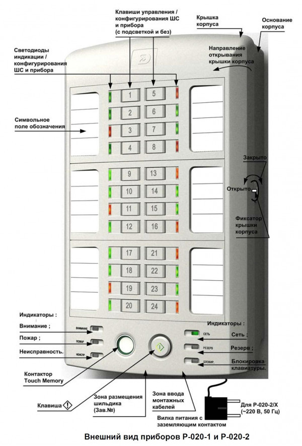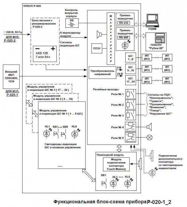 ППКОП Р-020-2 - автономный/сетевой прибор приёмно-контрольный охранно-пожарный на 24 ШС (универсальных) с подключением в качестве сетевого устройства по интерфейсу RS-485 к БЦП Р-08, Р-060, в пластмассовом корпусе, с встроенными: блоком питания под АКБ (7 или 9 Ач - 1шт. приобретается), консолью управления, считывателем интерфейса (Touch Memory), со степенью защиты - IP20 входит в состав ИСБ "Индигирка".