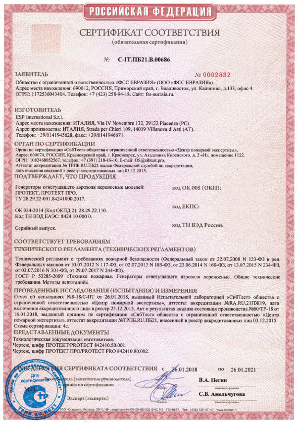 Протект ПРО - переносной генератор огнетушащего аэрозоля ручного действия предназначен для оперативного применения при ликвидации очагов возгораний и пожаров классов А (подкласс А1, подкласс А2), В, С и Е под напряжением до 35 кВ.