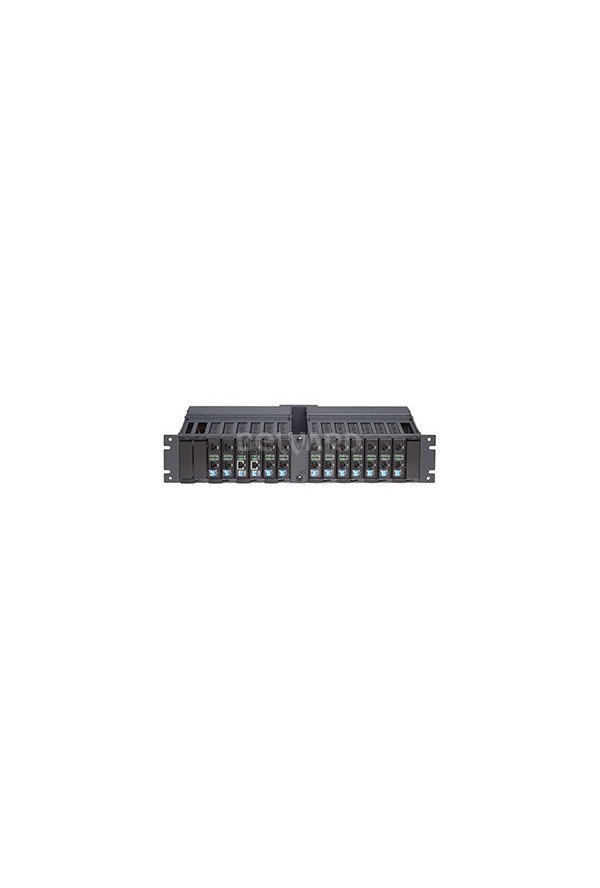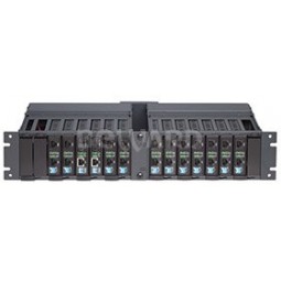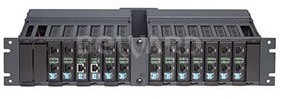 8 посадочных мест на 2U 10 стойки, монтаж 2-х шасси в 19 стойку, горячая замена медиаконвертеров, блок питания 220 В (AC).