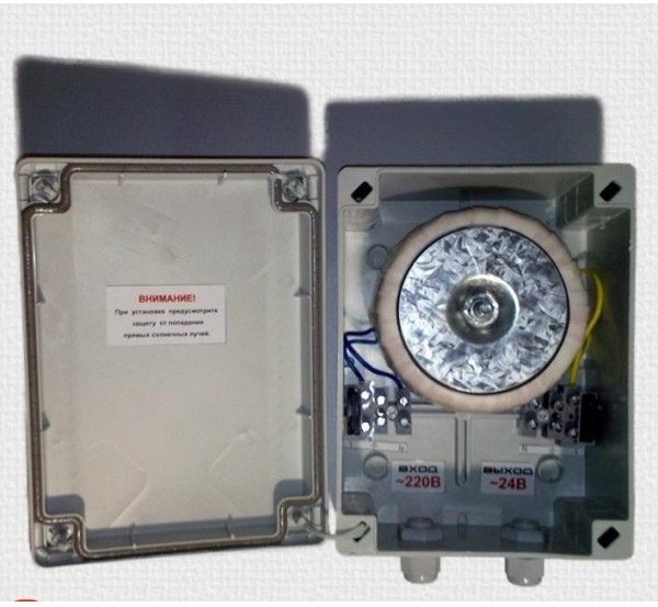 Источник нерезервированный уличный (IP56), выходное напряжение 24В АC, ток нагрузки при работе от сети 5,0А, макс. кратковременный ток нагрузки (60сек) 5,5А, входное напряжение 210-230В 50-60Гц АС, габариты 170х124х88 мм, вес 1,30 кг, темп.окр.среды -25...+40 С .