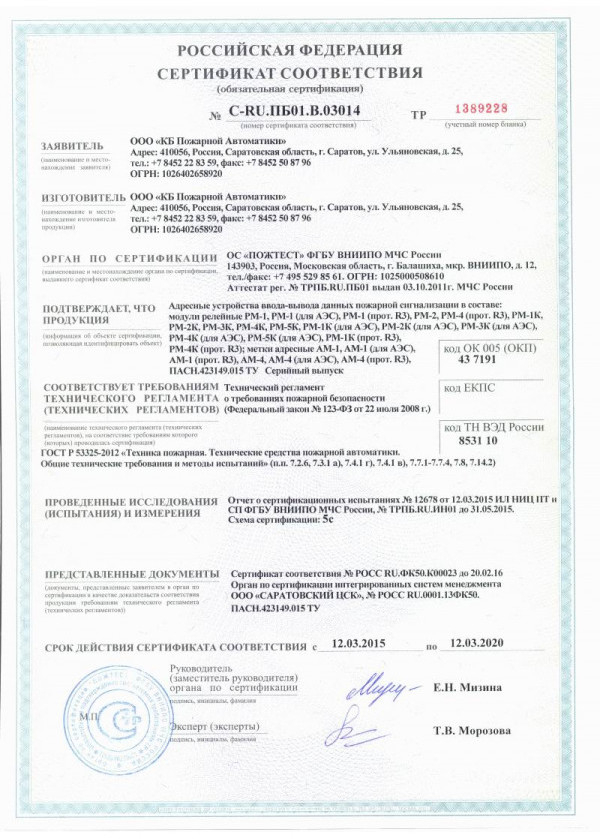 РМ-1К - адресный релейный модуль на 1 выход (НО) предназначен для управления исполнительными устройствами, входящими в состав адресной системы под управлением приемно-контрольного прибора «Рубеж-2АМ», «Рубеж-4А», «Рубеж-2ОП», ППКПУ серии «Водолей».