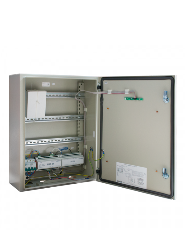 Шкаф для установки приборов системы Орион на DIN рейки. Содержит источник питания 12В - 3 А с интерфейсом RS-485. Место для установки двух батарей 12В-17АЧ. Защита оболочки IP54