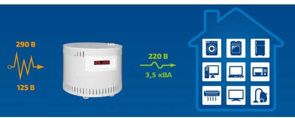 Мощность нагрузки 3,5 кВА, круглый корпус Башня . Микропроцессороное управление. Диапазон входного напряжения, 125-290 В.