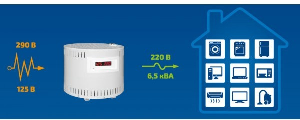 Мощность нагрузки 6,5 кВА, круглый корпус Башня . Микропроцессороное управление. Диапазон входного напряжения, 125-290 В.