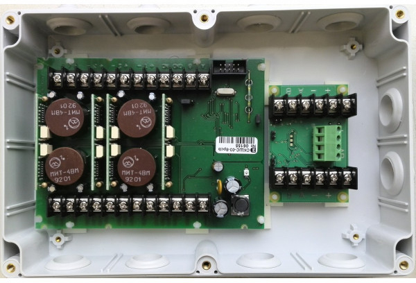 СКШС-03-8 П имеет два ввода питания, что позволяет использовать два источника питания постоянного тока напряжением (10 … 28) В типа ИБП-2400. Номинальное напряжение источников питания должно отличаться – не более 5 %.