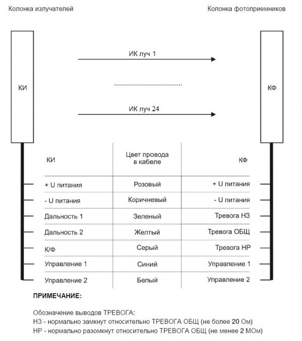 СПЭК-7-24х70 - извещатель охранный линейный оптико-электронный 24-х лучевой активный в составе: колонка излучателей и колонка приёмников с кабельными выводами предназначен для обнаружения проникновения через периметр охраняемого объекта и формирование извещения о тревоге путем переключения (1 НО и НЗ) выходных контактов оптоэлектронного реле.