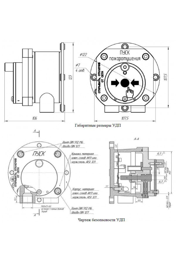 Спектрон-512-Exd-Н-УДП-01 - извещатель из нержавеющей стали пожарный жёлтого цвета ручной на 2 кабельных ввода (приобретаются отдельно) взрывозащищенный (РВExdI/1ExdIICT6), степенью защиты (IP68), с надписью - "Пуск пожаротушения" предназначен для ручного запуска исполнительных механизмов систем пожаротушения в системах автоматического пожаротушения и пожарной сигнализации и применяется на предприятиях химической, нефтегазодобывающей, нефтегазоперерабатывающей отраслей, в подземных выработках шахт, рудников и их наземных строениях, в взрывоопасных зонах класса (1 и 2) других производств.