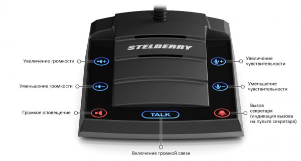 Stelberry D700 Дуплексное переговорное устройство директор-секретарь. Улучшенные звуковые характеристики. Сенсорное управление, линейный аудиовыход для записи переговоров, двухпроцессорное управление звуком, подсветка микрофона, поролоновая насадка для ветровой защиты, громкость пультов 84 дБ, тактильное покрытие пульта, диапазон рабочих температур панели клиента +10 С...+35 С, питание 12 Вольт, потребление до 310 мА, блок питания в комплекте.