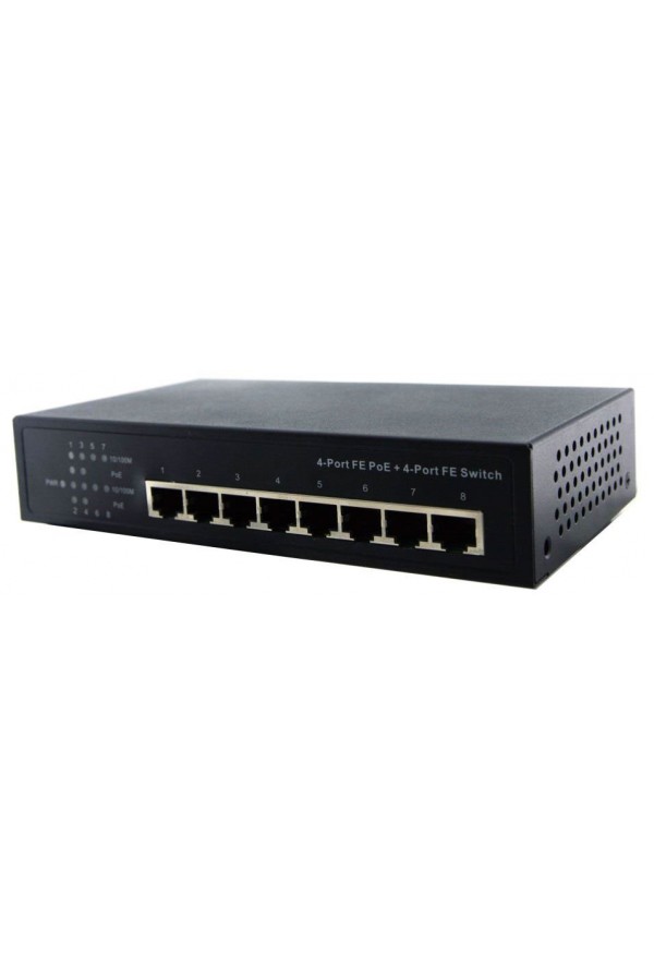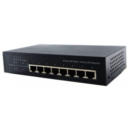 PoE коммутатор Fast Ethernet на 8 портов. Порты 4 x FE (10/100 Base-T) с поддержкой PoE (IEEE 802.3af/at), 4 х FE (10/100 Base-T) . Мощность PoE на порт - до 30W. Суммарная мощность PoE до 65W. Питание AC100-240V. Внешний БП. Размеры 266 x 160 x 44 мм. Рабочая температура 0...+45 гр. С.