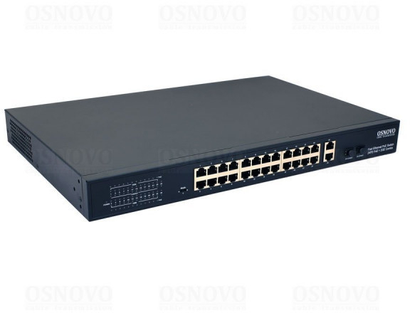 PoE коммутатор Fast Ethernet на 24 x RJ45 портов + 2 x GE Combo uplink порта. Порты 2 x FE (10/100Base-T) с PoE (до 60W, A+B) + 22 x FE (10/100Base-T) с PoE (до 30W), 2 x GE Combo Uplink (RJ45 + SFP). Соответствует стандартам PoE IEEE 802.3af/at/bt. Автоматическое определение PoE устройств. Суммарная мощность PoE до 385W. Поддержка режима CCTV Увеличение расстояния передачи данных и питания до 250м, изоляция портов (VLAN). Встроенная грозозащита 3kV на порт. Питание AC100-240V (400W). Встроенный БП. Монтаж в 19 - дюймовую стойку, крепление в комплекте. Размеры (ШxВxГ) 440 x 45 x 290мм. Рабочая температура -10...+55 гр. С.