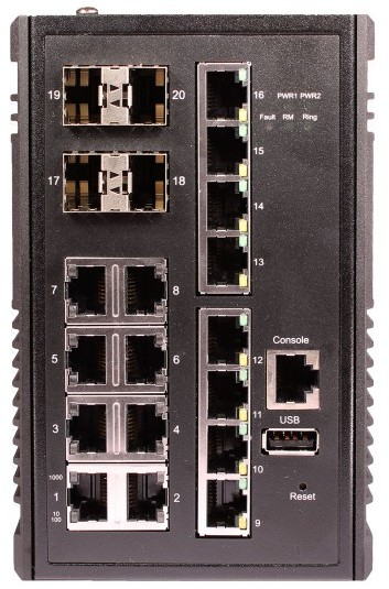 Промышленный управляемый (L2+) коммутатор Gigabit Ethernet на 20 портов. Порты: 16 x GE (10/100/1000Base-T) + 4 x GE (SFP 1000Base-X).