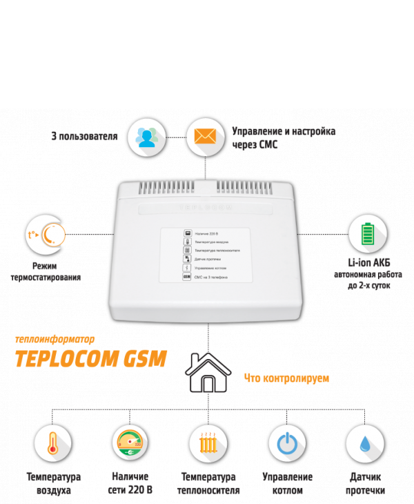TEPLOCOM GSM Теплоинформатор предназначен для информирования вас о состоянии системы отопления и предупреждении об аварийных ситуациях, приводящих к остановке теплоснабжения, а также управления системой отопления через GSM канал.