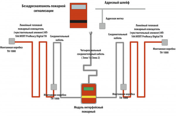 - Два варианта подключения линейного теплового пожарного извещателя :