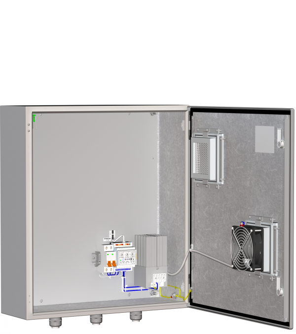 Термошкаф. Класс защиты - IP55. Потребляемая мощность 178Вт. Напряжение питания 220В 15 AC, 6A. Габариты - 600x600x210. Диапазон температур от -50 С +50 C.