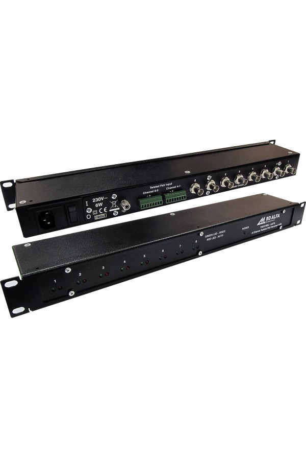 Активный 8-канальный приёмник-автомат. Высококачественное восстановление видеосигнала при передаче по витым парам (СAT5 UTP) длиной до 900 м. Автоматическое восстановление общего уровня видеосигнала в каждом канале независимо. Автоматическая компенсация высокочастотных потерь в линии для цветного видеосигнала в каждом канале независимо. Светодиодная индикация включения автоматической регулировки общего уровня видеосигнала и автоматической компенсации высокочастотных потерь в линии в каждом канале. Быстрая привязка уровня черного Встроенная грозозащита и трансформаторная развязка по входам. Входы приемника гальванически изолированы от сигнальной линии. Это позволяет использовать устройства на объектах с высоким уровнем помех.