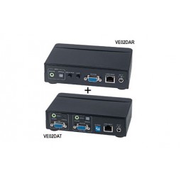 Комплект (передатчик VE02DAT+ приёмник VE02DAR) для передачи VGA- и цифрового аудиосигналов на расстояние до 300 м по кабелю витой пары СAT 5. Разрешение VGA-сигнала до 1600х1200, 85 Гц. АЦП аудиосигнала 16-бит, встроеннная регулировка усиления. Поддержка стандартов аудиосигналов LPCM до 96 кГц, Dolby Digital, DTS. VE02DAT 1 видеовход (DB15)+ 2 аудиовхода (TRS 3,5 мм + Optical), сквозные выходы (DB15, TRS 3,5 мм + Optical). VE02DAR 1 видеовыход (DB15), 2 аудиовыхода S/PDIF (TRS 3,5 мм + Optical). 2 блока питания в комплекте