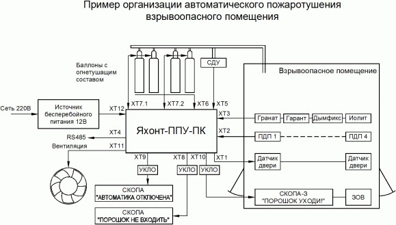 Яхонт ППУ-ПК - прибор управления (с наличием функций ППКОП) искробезопасный электрозапускаемой установкой газового, порошкового или аэрозольного пожаротушения 1-ой взрывоопасной зоны в автоматическом или ручном (дистанционном) режимах, взрывозащищённый (ExiаGaIIB), но с установкой вне взрывоопасной зоне, степенью защиты (IP20), напряжением 2-ух раздельных входов питания (10 - 14,2 В).