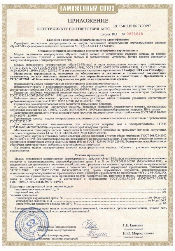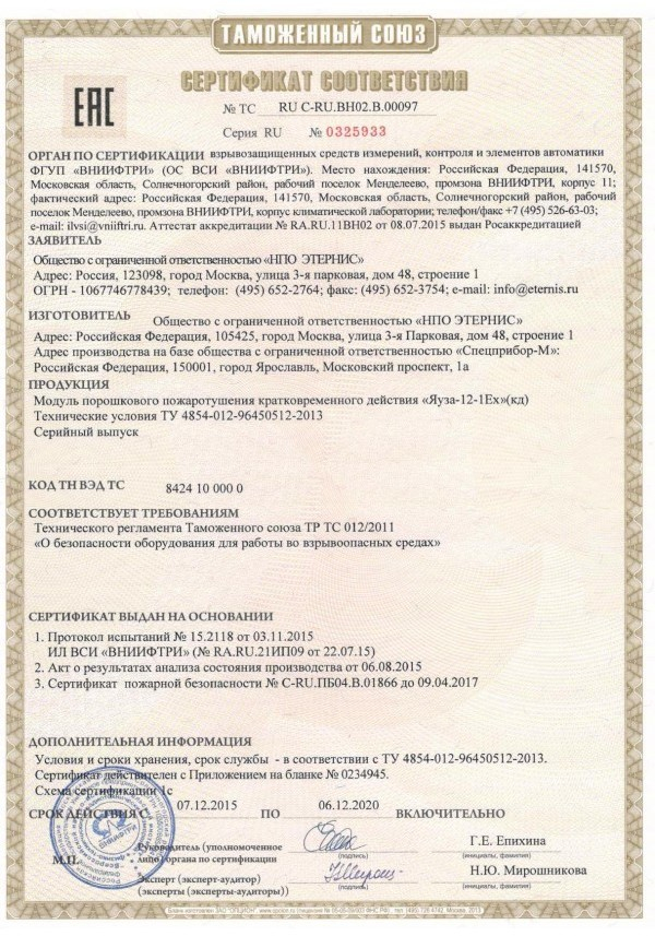 Модуль порошкового пожаротушения взрывозащищенный, классы А и В, эл.оборуд. до 1000В, Iпуск 100мА, -50 +50 С, 1Exds[ia]llBT4/РВExds[ia]I