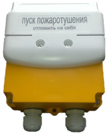 УДПП 535-26 Север Пуск Пожаротушения - извещатель из ABS пластика пожарный жёлто-серого цвета ручной на 2 кабельных ввода, степенью защиты (IP66), с надписью - "Пуск пожаротушения" для ручного запуска исполнительных механизмов систем пожаротушения в системах автоматического пожаротушения и пожарной сигнализации.