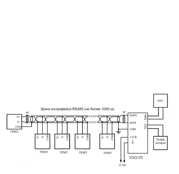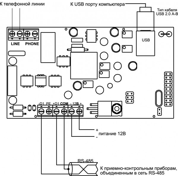 - подключение в телефонную линию для передачи сообщений, полученных от ППКП РУБЕЖ;